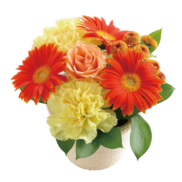 ガーベラ、バラ、カーネーション、スプレーマム、マルバルスカス、バスケット