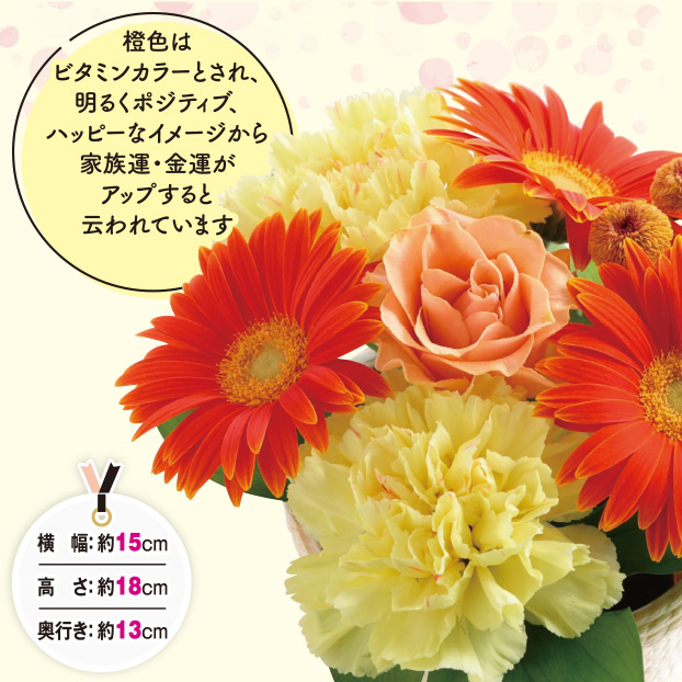 白浜町のガーベラファーム西浦の元気なガーベラをメインにカーネーションを合わせてアレンジしました。橙色はビタミンカラーとされ、明るくポジティブ、ハッピーなイメージから家族運・金運がアップすると云われています。いつも明るく元気なお母さんにおすすめです。