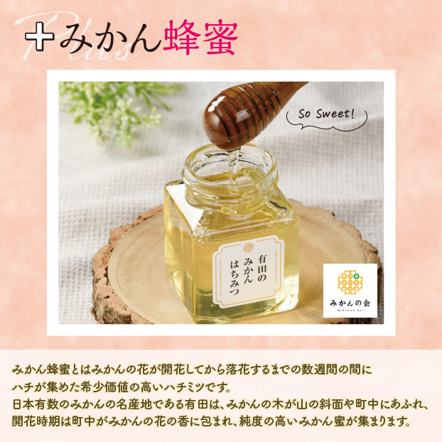 みかん蜂蜜とはみかんの花が開花してから落花するまでの数週間の間にハチが集めた希少価値の高いハチミツです。日本有数のみかんの名産地である有田は、みかんの木が山の斜面や町中にあふれ、開花時期は町中がみかんの花の香に包まれ、純度の高いみかん蜜が集まります。