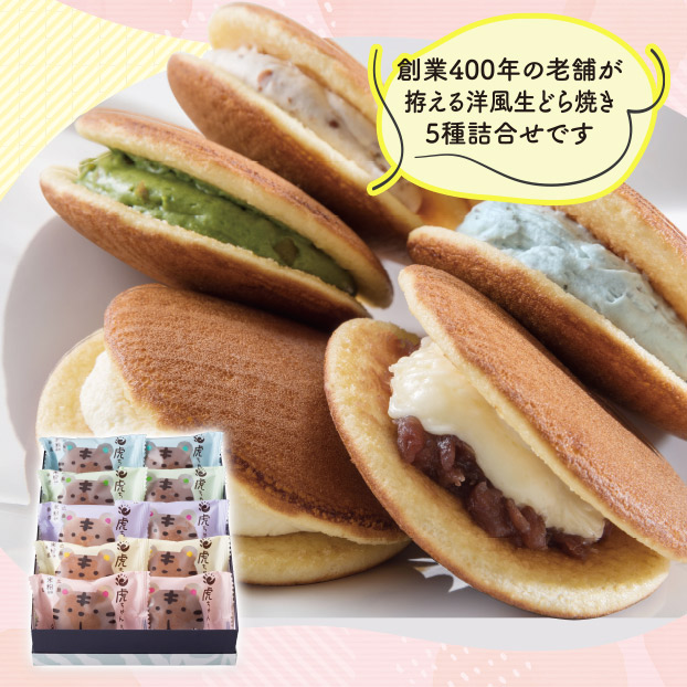 創業400年の老舗が拵える洋風生どら焼き5種詰合せです。