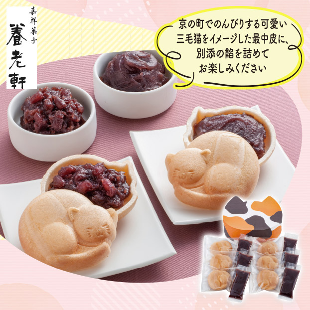 京の町でのんびりする可愛い三毛猫をイメージした最中皮に、別添の餡を詰めてお楽しみください。