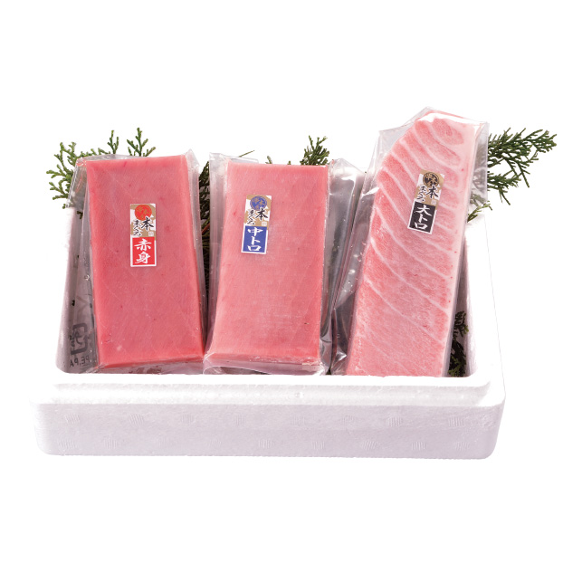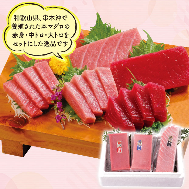 和歌山県、串本沖で養殖された本マグロの赤身・中トロ・大トロをセットにした逸品です