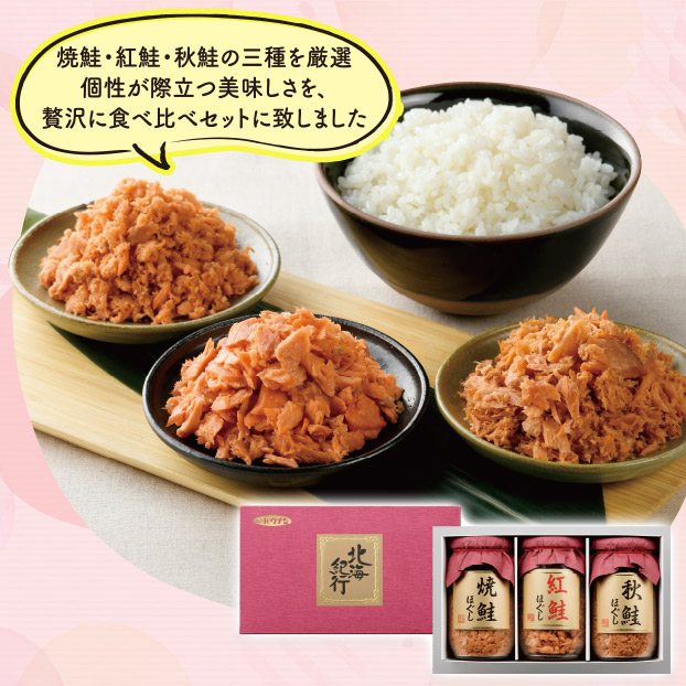 焼鮭・紅鮭・秋鮭の三種を厳選。個性が際立つ美味しさを、贅沢に食べ比べセットに致しました。