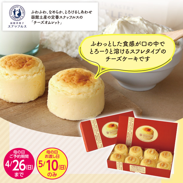 ふわっとした食感が口の中でとろーりと溶けるスフレタイプのチーズケーキ。ふわふわ、なめらか、とろけるしあわせ。函館土産の定番スナッフルスの「チーズオムレット」