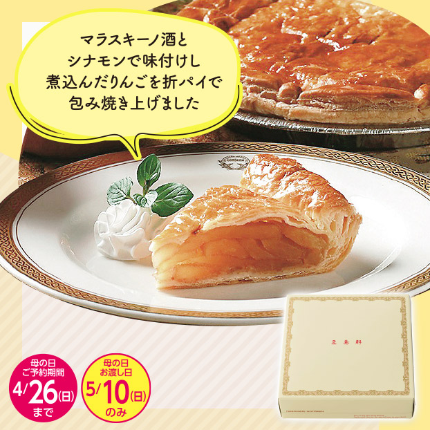 マラスキーノ酒とシナモンで味付けし煮込んだりんごを折パイで包み焼き上げました。