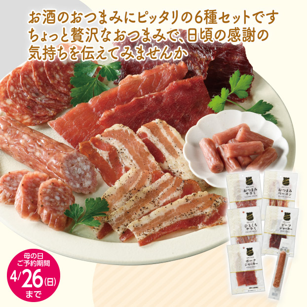 お酒のおつまみにピッタリの6種セットです。ちょっと贅沢なおつまみで、日頃の感謝の気持ちを伝えてみませんか。