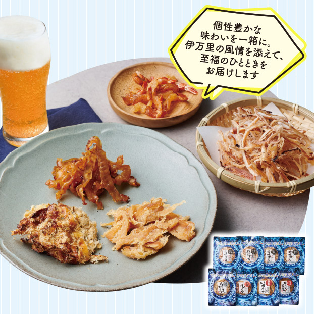国産殿様するめ15g×4袋、ブラックペッパーあんこうの荒ほぐし16g、キムチ貝ひも19g、焼きえび16g、燻製いかチーズ23g各1袋