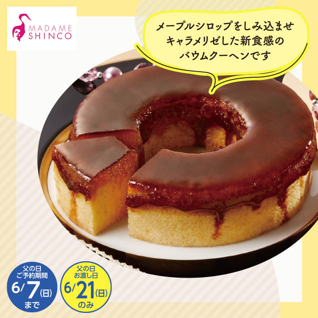 メープルシロップをしみ込ませキャラメリゼした新食感のバウムクーヘンです。