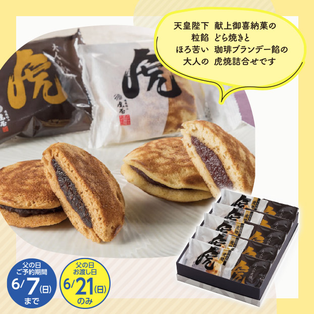 天皇陛下献上御喜納菓の粒餡どら焼きとほろ苦い珈琲ブランデー餡の大人の虎焼詰合せ。