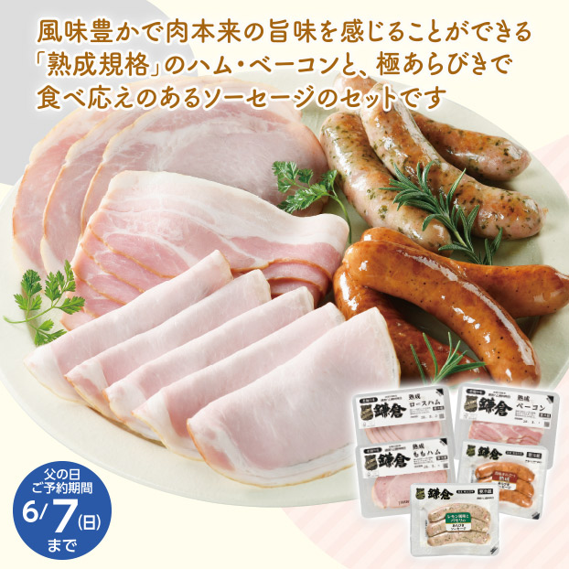 風味豊かで肉本来の旨味を感じることができる「熟成規格」のハム・ベーコンと、極あらびきで食べ応えのあるソーセージのセットです。