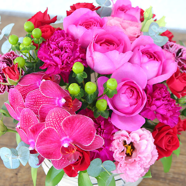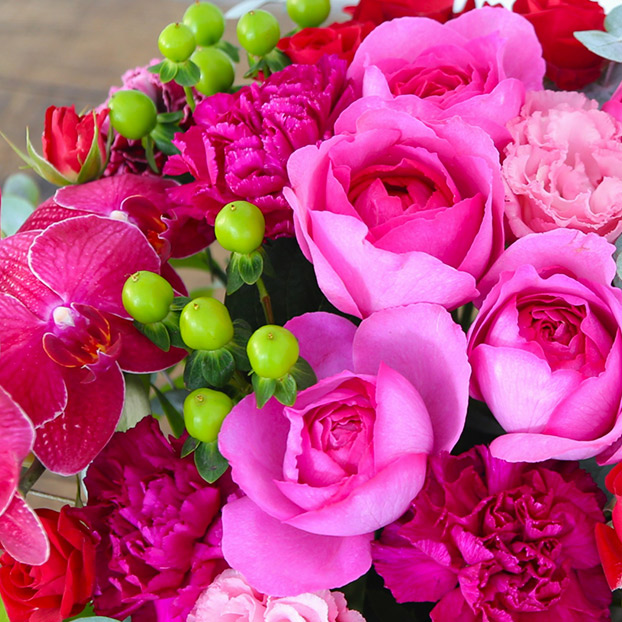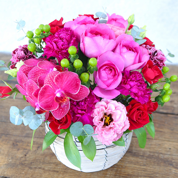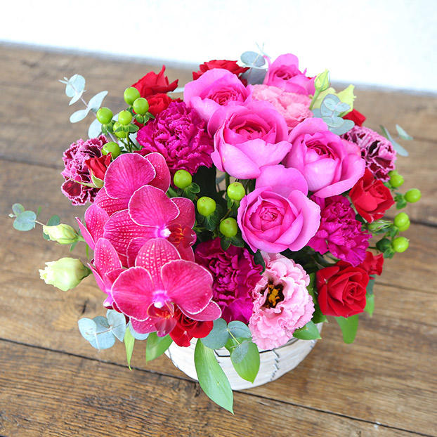 カップ咲のバラと紫色複色のカーネーションをメインに胡蝶蘭を添えて母の日プレゼント用にアレンジしました。